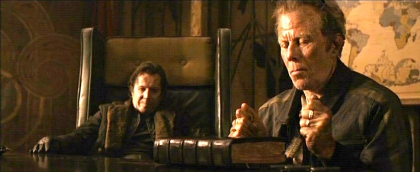 I think this scene is unfortunate– I don’t like the film’s decision in that moment to make Carnegie’s book-hunt a self-aware, bluntly evil dealio, because aside from that speech, the villain’s motivations are far more ambiguous (in some old interview that I recall but haven’t been able to relocate just yet, Oldman states that indeed, in the initial script Carnegie had much more nuance). I’m also not crazy about the eventual establishment of Eli as a superhuman Chosen One type who is impervious to bullets and directly guided by a higher power. It’s just a little too easy.