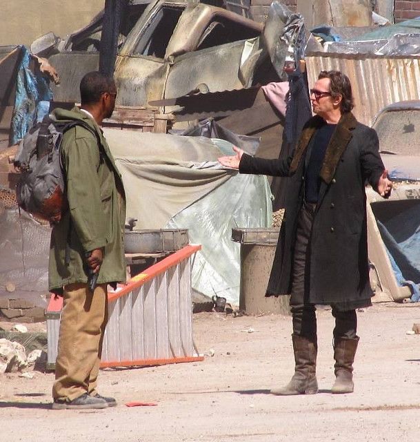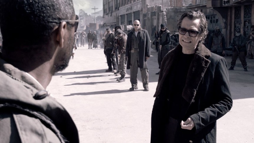 The Book of Eli is a about a lone (very alone) gunslinger/knife-fighter (Denzel as Eli) who has walked the earth since an apocalyptic event rocked the world, making water scarce. Also, sometime before “The Blast” all religious books were destroyed. Books in general are kind of hard to come by, and thus the literate are a rare breed. But Eli CAN read, and he has spent thirty years doing nothing but walking Westward and poring over his favorite book. On his journey he regularly encounters menacing, desperate folk who attack him for whatever resources he has, but woe to them, because Eli is a super efficient fighting machine! His lone (so alone) lifestyle gets shaken up when he walks into a desert town run by a crooked sheriff type (Gary as Carnegie), who also happens to be a big reader. In another life, these two might have formed a book club together, but here in Dystopia, they share an obsession with THE Book– AKA the Bible. Eli has it, Carnegie wants it.