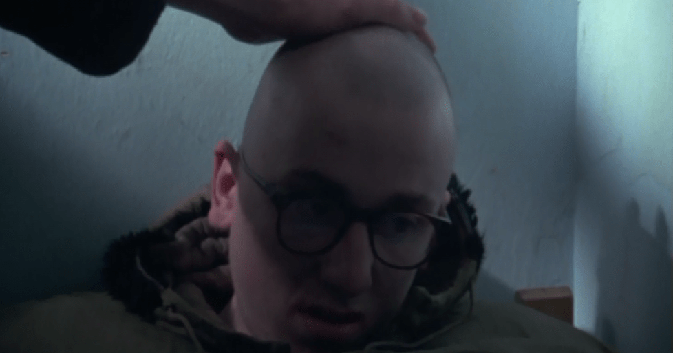 The next morning, Colin reveals to Mark what he’s done. In an honestly shocking moment, his unzipped jacket hood reveals his freshly shaved head.